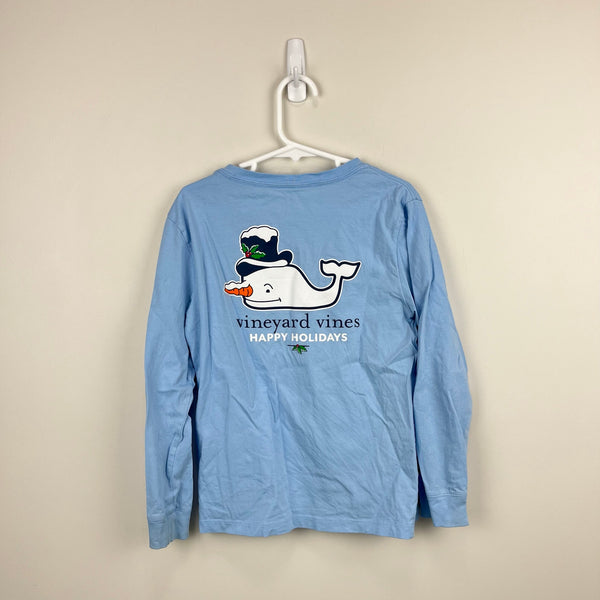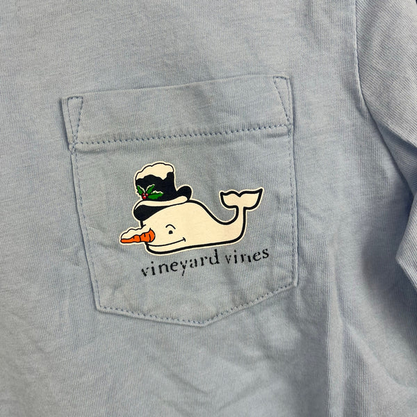 Vineyard Vines Snowman Whale Pocket Tee Shirt. Boy or girl size 6. Casual long sleeve light blue top with a preppy snowman whale on the back and chest. Tiny snag at collar and untreated mark (see last two photos), but otherwise great condition. Perfect for Christmas and all winter long!