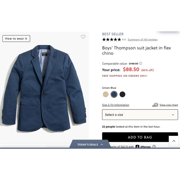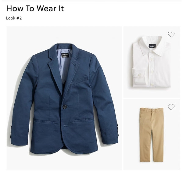 J. Crew Kids Thompson Navy Blue Flex Chino Suit Jacket. Boys size 6-7 years. Classic navy blazer. Light marks on back of cuff (see last photo; untreated), but otherwise excellent condition.
