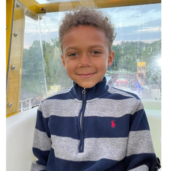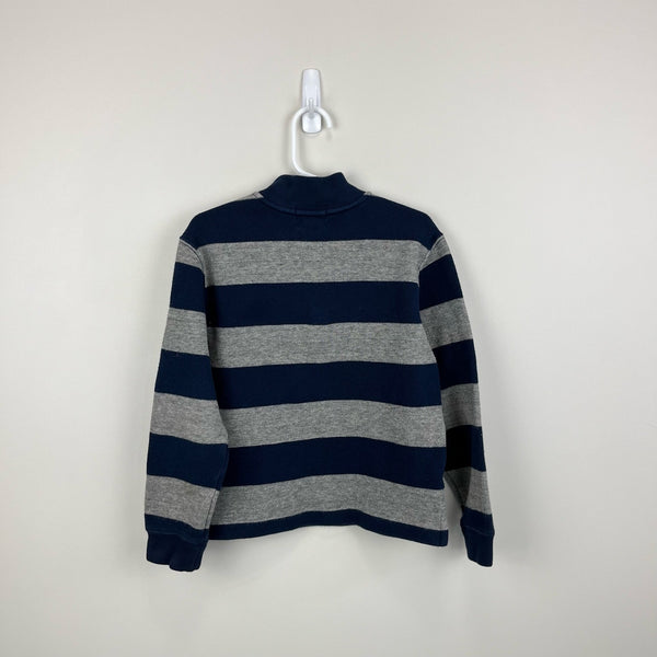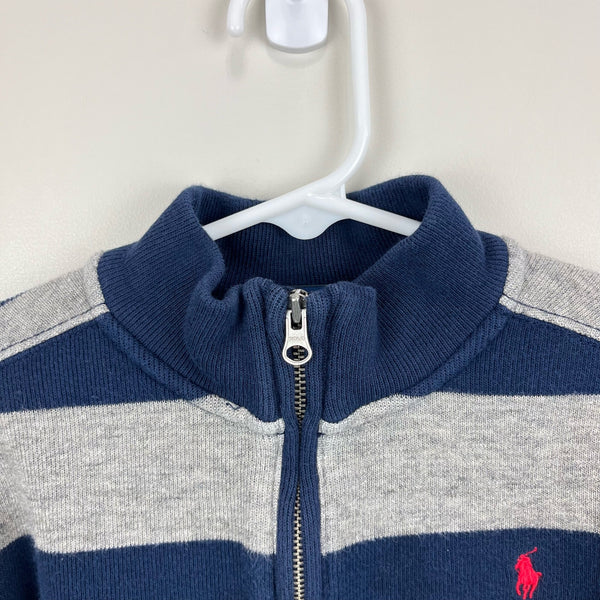 Ralph Lauren Navy Gray Quarter Zip Sweater. Boys size 6. Cozy pullover in thick navy blue and gray stripes. Signature embroidered polo poly on chest. Super faint mark (see last photo; untreated).