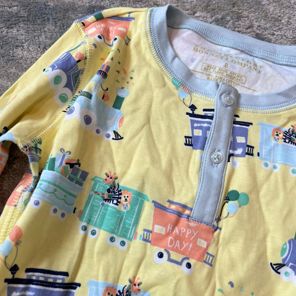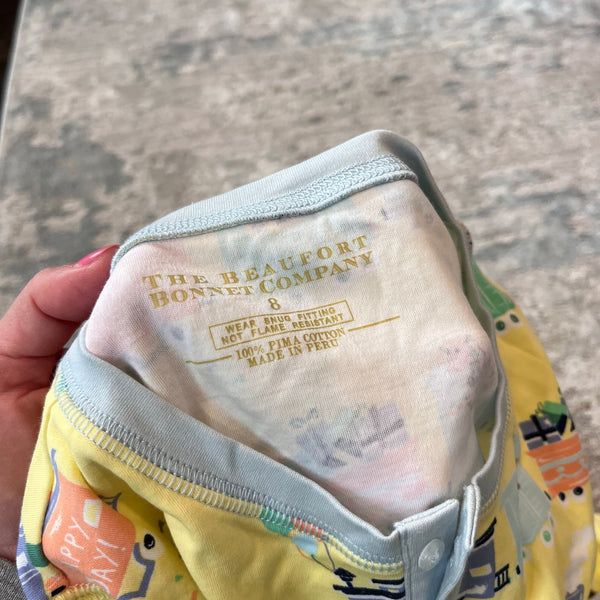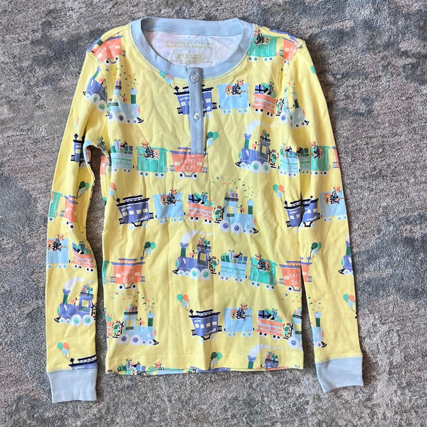 The Beaufort Bonnet Company Sutton's Sweet Dream PJs Set Party Train with Buckhead Blue. Boys size 8. Brand new without tag (NWT). Two piece, super soft pima cotton pajama set. Includes long sleeve button top and pull on pants bottom. Yellow with fun party train design - perfect for a birthday!