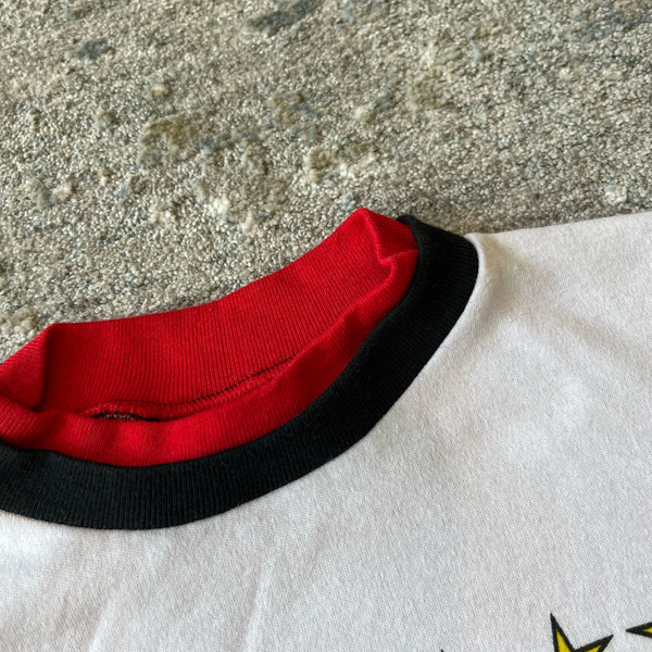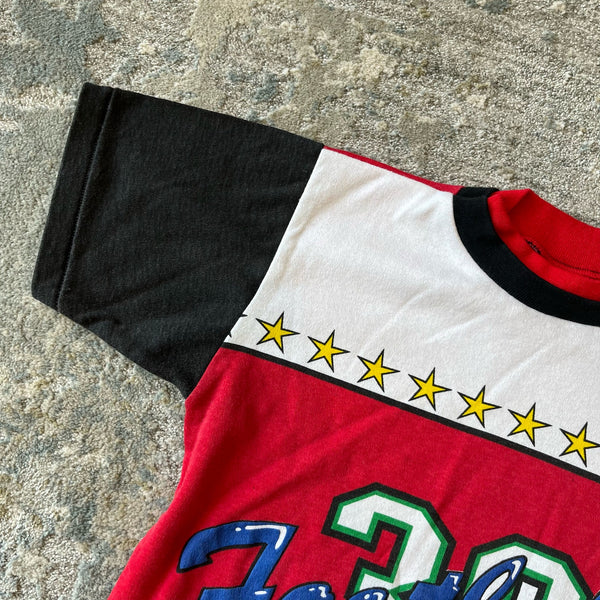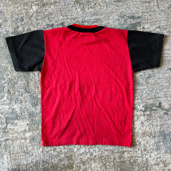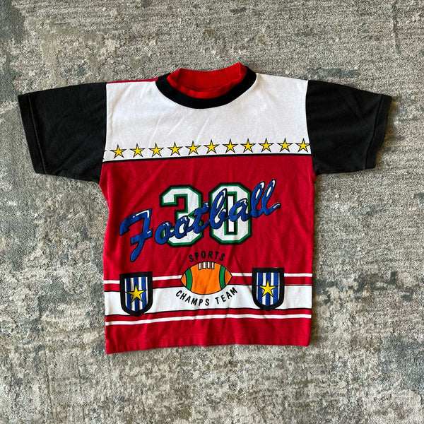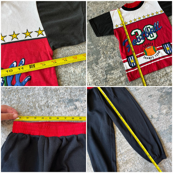 Vintage 90s Black Red Football Tee & Sweatpants. Casual short sleeve color block shirt by Locomotion. Size 6. Made in the USA. Fun design with stars and football. Pull on casual pants with elastic waist and ankles. Exchange Sport brand, size 6. See photos for measurements. Perfect for fall!