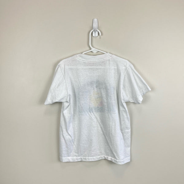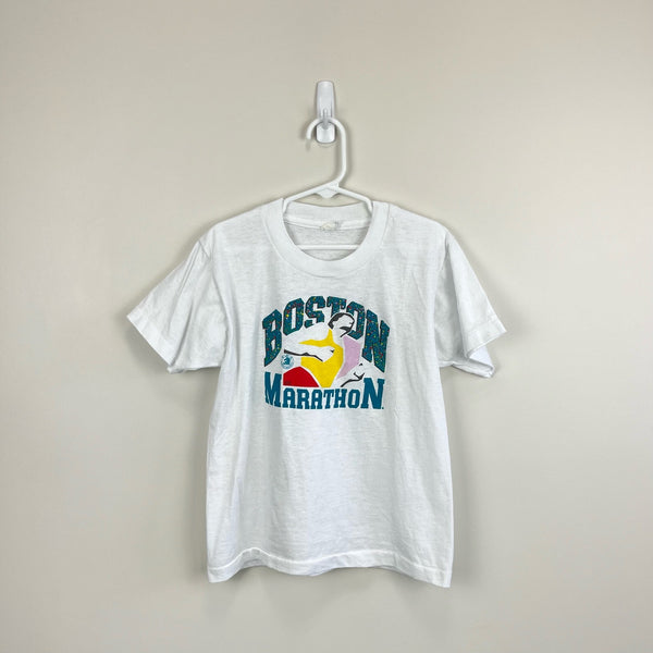 Vintage Boston Marathon T-Shirt. I purchased dead stock, brand new with tag (NWT) for my son and gave it a soak to remove marks from storage. The tag faded, so please check measurements to ensure fit. (I'd say around a 6-8 easy to wear oversized younger.) My son never ended up wearing it. White with colorful race design on the chest.