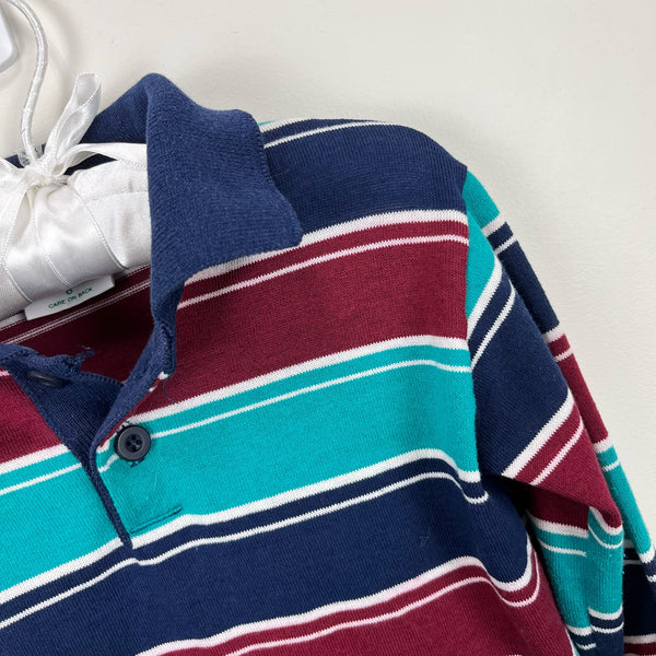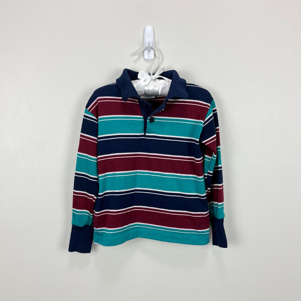Vintage Health-tex Striped Long Sleeve Polo Shirt. Little boy size 7. USA made. Casual long sleeve collared top in navy blue, burgundy red, and teal green stripes. Great with jeans for every day play!