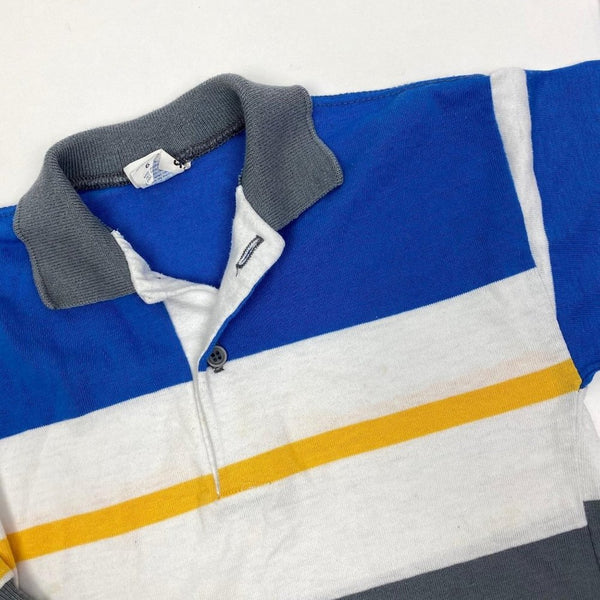 Vintage Peanuts Long-Sleeve Striped Polo Shirt. Boys size 6. Long sleeve top with chunky gray, yellow, and blue stripes. Has some very light, untreated marks. Great every day shirt paired with jeans!