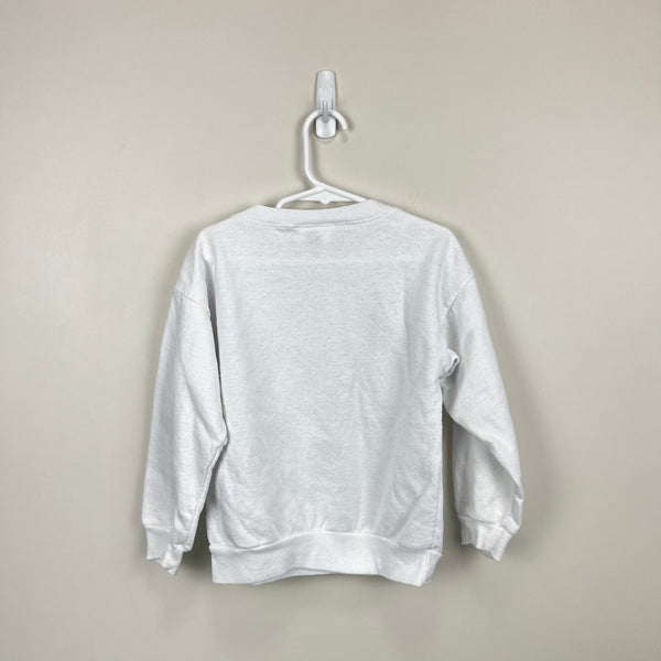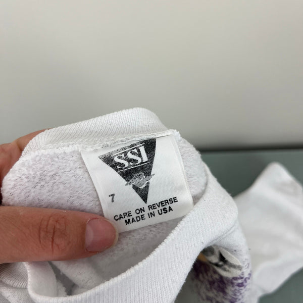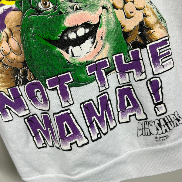 Vintage SSI Not The Mama! Dinosaurs TV Show Youth Sweatshirt. Boy or girl size 7. USA made. Long sleeve white crewneck pullover featuring dinosaur Dad, Earl Sinclair, and Baby from Disney's early 1990s ABC show.