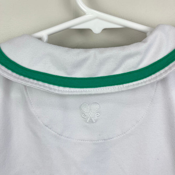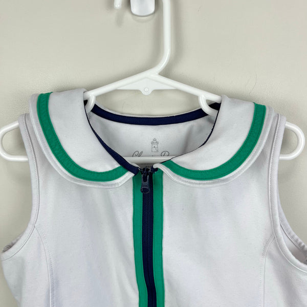 Classic Prep Childrenswear Vivian Performance Tennis Polo Dress. Girls size 8. Sleeveless white dress with contrasting navy blue and green trim along the collar and zipper. Flared hem. Original retail $75. Great condition with no flaws noted!