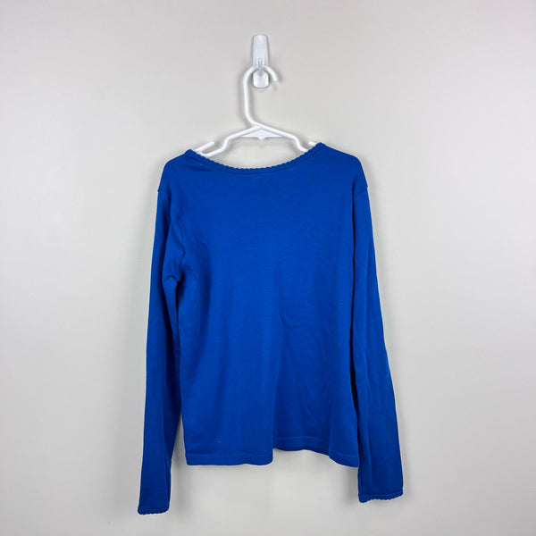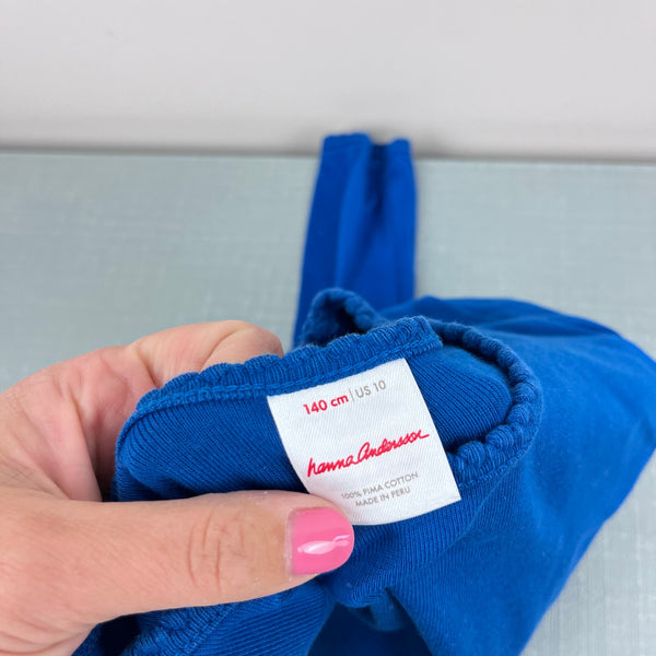 Hanna Andersson Bright Basics Tee Shirt. Girls size 140 cm (US 10 years). Super soft long sleeve top in bright blue with scalloped ribbing. Excellent condition.