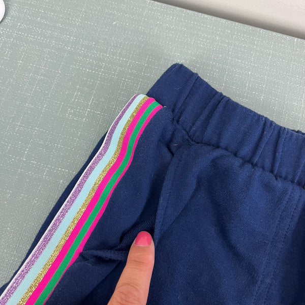Crewcuts Navy Blue Rainbow Stripe Shorts. Girls size medium (8 years). Cozy pull on shorts in sweatshirt material. Fun, sparkly multicolored stripes down the sides. Light wear to the fabric. Has pockets!