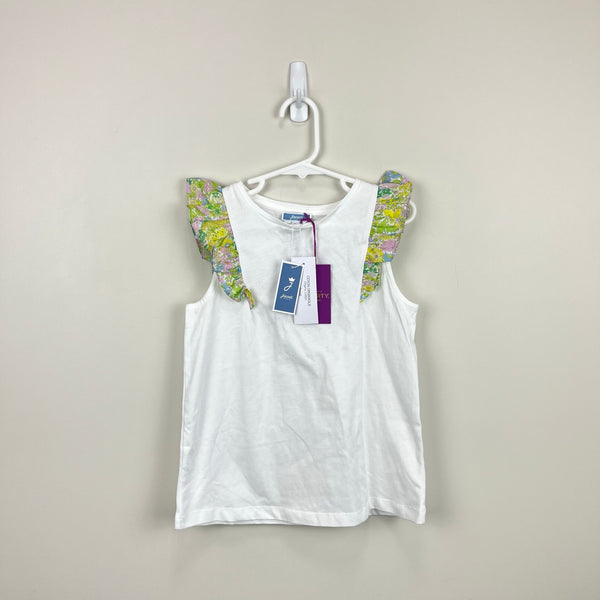 Jacadi Paris Girl T-shirt With Liberty Fabric Sleeves. Girls size 8 years. Brand new with tags (NWT). Organic cotton and jersey. Sleeveless white tank top with gorgeous yellow, green, blue, and pink liberty floral ruffles.