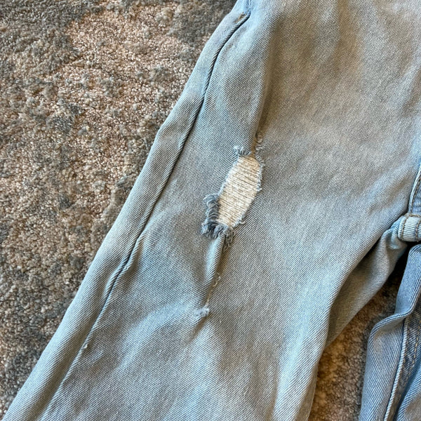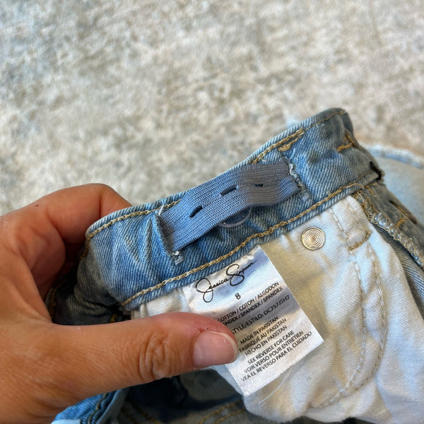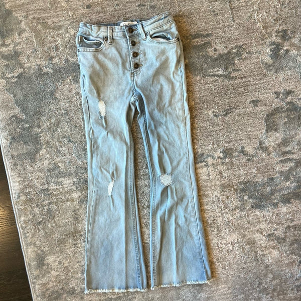 Jessica Simpson Girls Button Fly Light Wash Sidney Flare Leg Distressed Jeans. Girls size 8. Adjustable tabs in the waist. Good stretch for a perfect fit. Retro, vintage style with distressing and frayed hem. Worn and washed once or twice, just wrinkled from sloppy folding in my daughter's drawer!