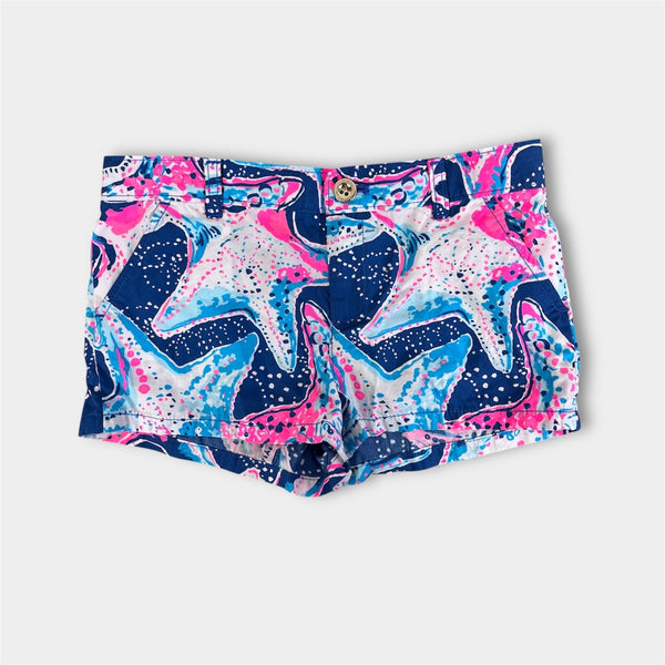 Lilly Pulitzer Indigo Star Struck Mini Callahan. Girls size 10. Fun and bright blue and pink starfish pattern with gold button. Adjustable tabs in waist. So cute with a simple tank for summer!