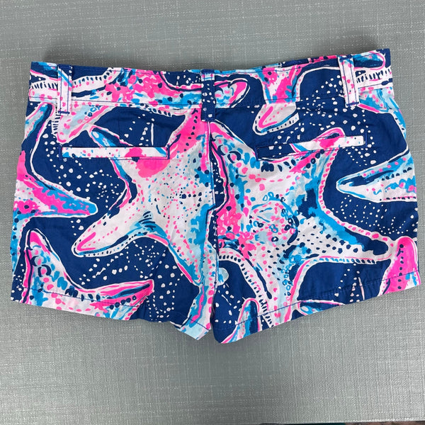 Lilly Pulitzer Indigo Star Struck Mini Callahan. Girls size 10. Fun and bright blue and pink starfish pattern with gold button. Adjustable tabs in waist. So cute with a simple tank for summer!