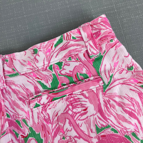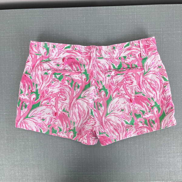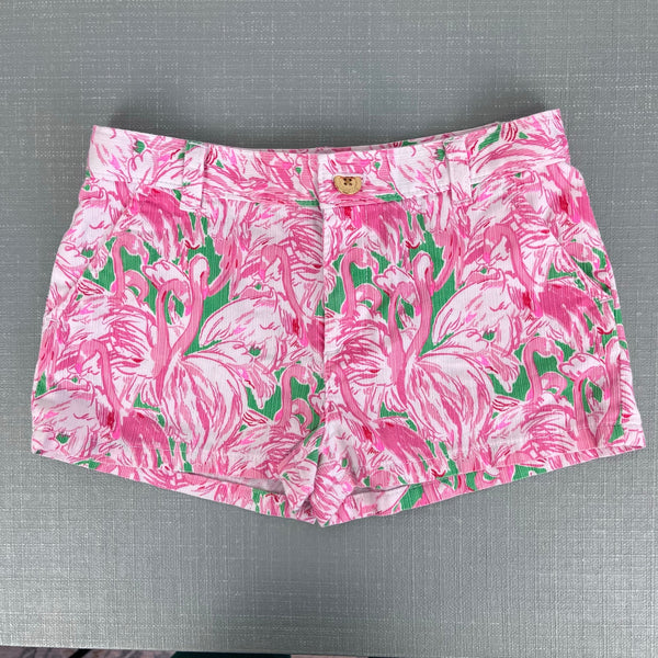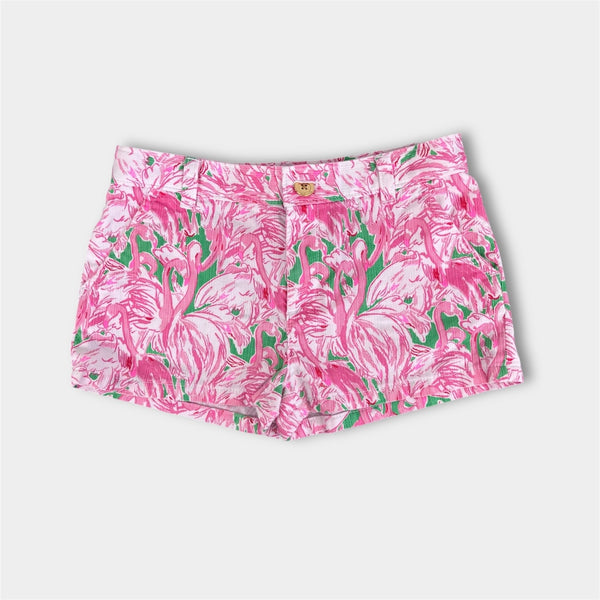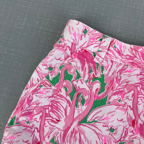 Lilly Pulitzer Mini Callahan Shorts Prep Green Pink Colony Small. Girls size 7. Fun flamingo print. Adjustable waist. So cute with a simple tank for summer!