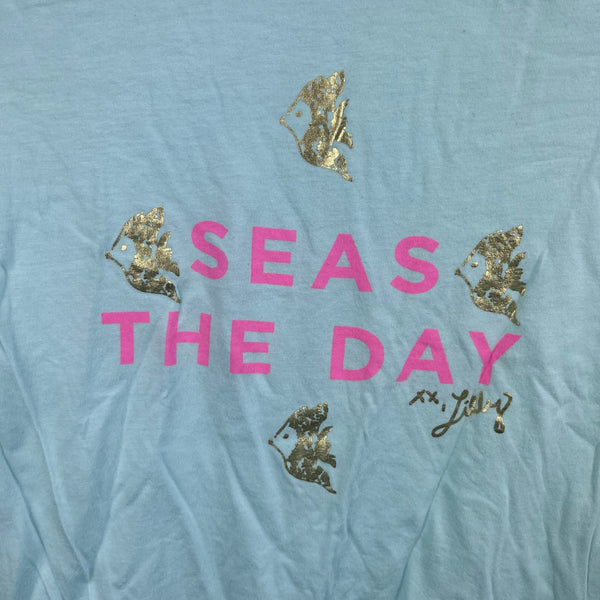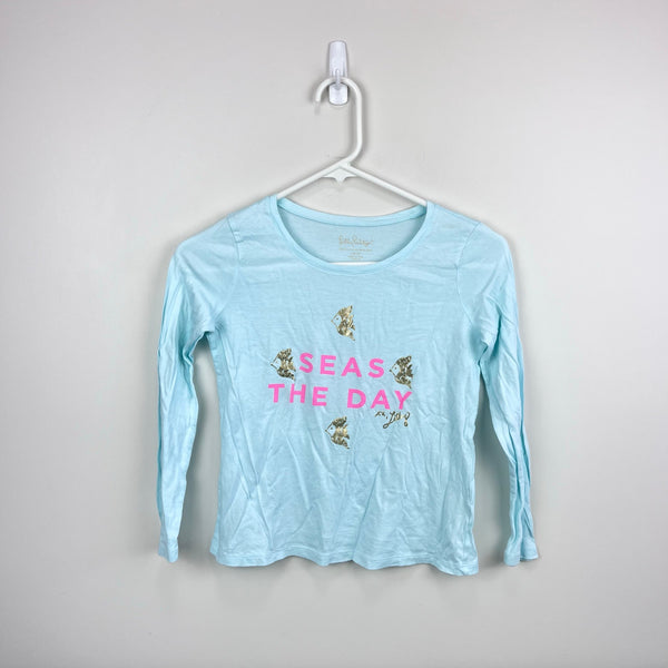 Lilly Pulitzer Kay Top Pink Sunset Seas the Day Graphic Tee Shirt. Girls size large (8-10 years). Long sleeve, light weight aqua green top with pink lettering and gold fish and xx, Lilly. Excellent condition; just wrinkled from being in my daughter's drawer!