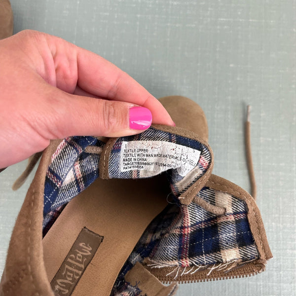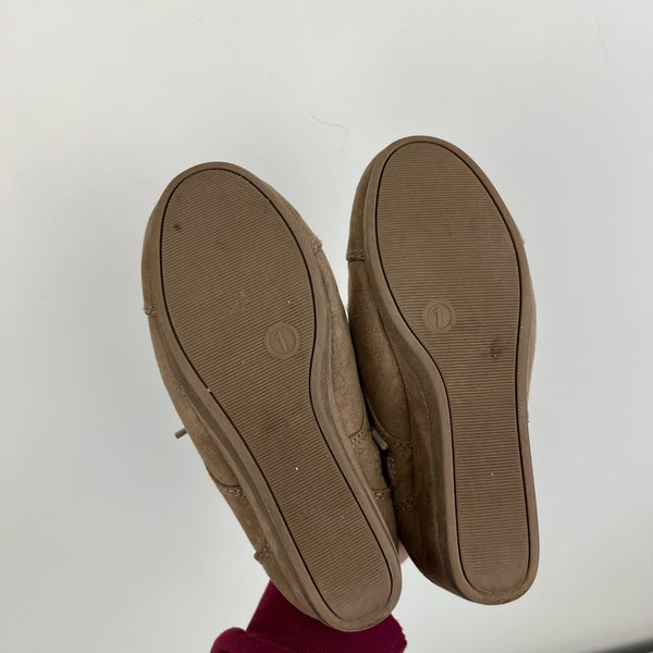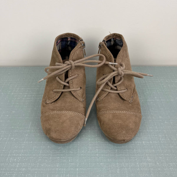 Mad Love Girls Shelby Wedge Suede Booties Tan. Girls shoe size 1. These are the cutest for fall! Pair with jeans or tights and a skirt. Zipper on the side. Light marks/wear.