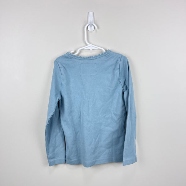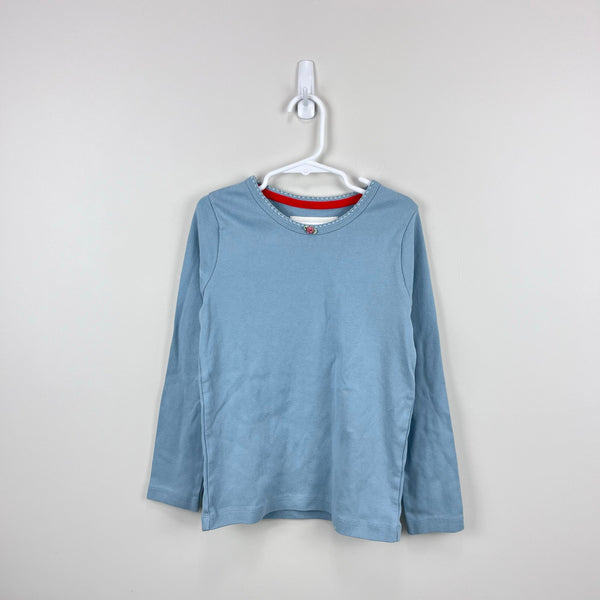 Mini Boden Long Sleeve Rosebud Tee Shirt. Girls size 8-8 years. Casual pale blue top with picot trim and rosebud detail at the neck. Super soft and cozy. Excellent condition.