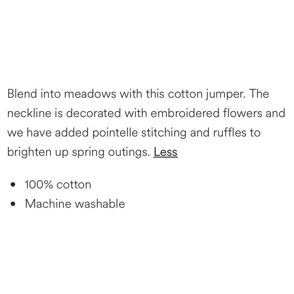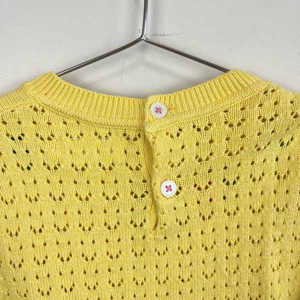 Mini Boden Pointelle Knit Sweater Top Soft Lemon. Girls size 8-9 years. Accidentally went through the wash with the tag on it (on cold, line dried). Never worn, despite my daughter insisting she needed this in her wardrobe. (And despite it being the most gorgeous sweater ever!) Fun ruffle along the neck with embroidered flowers and bumblebee. Buttons in the back.
