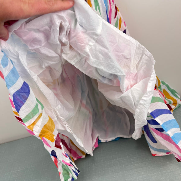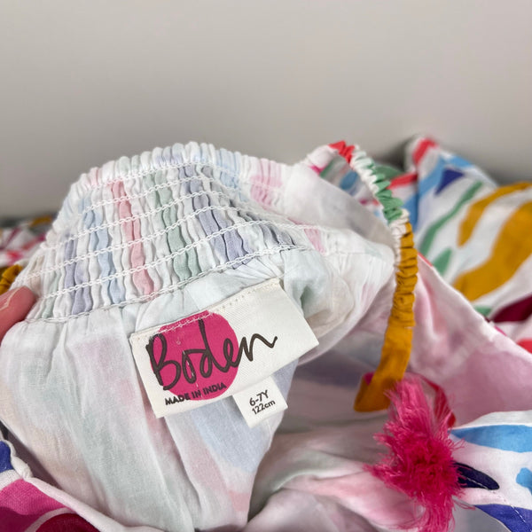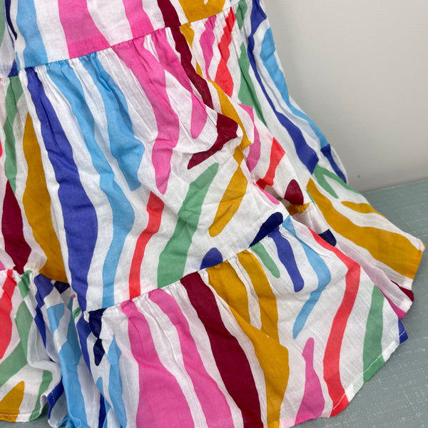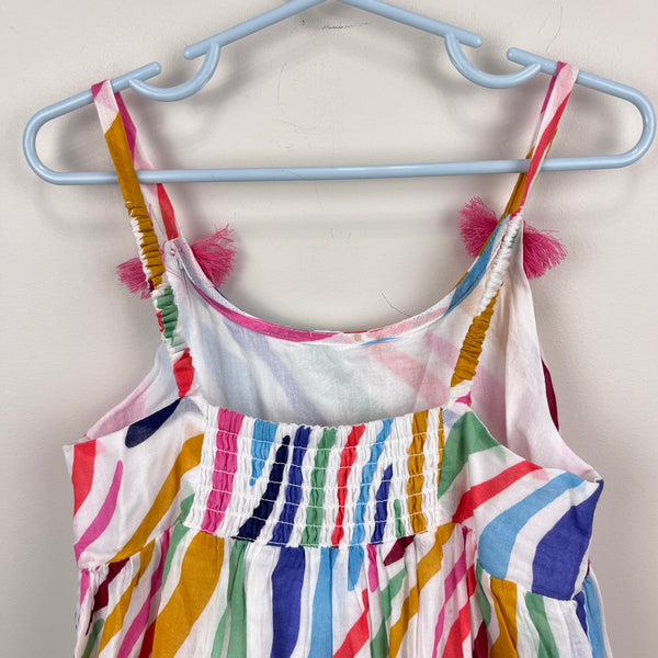 Mini Boden Tiered Tassel Dress Multi Rainbow Zebra. Girls size 6-7 years. Tank top dress with fun pink tassels at the straps and colorful zebra style stripey print. Perfect for summer! Original retail $64.