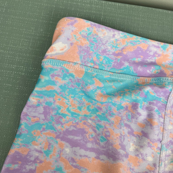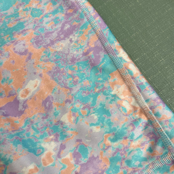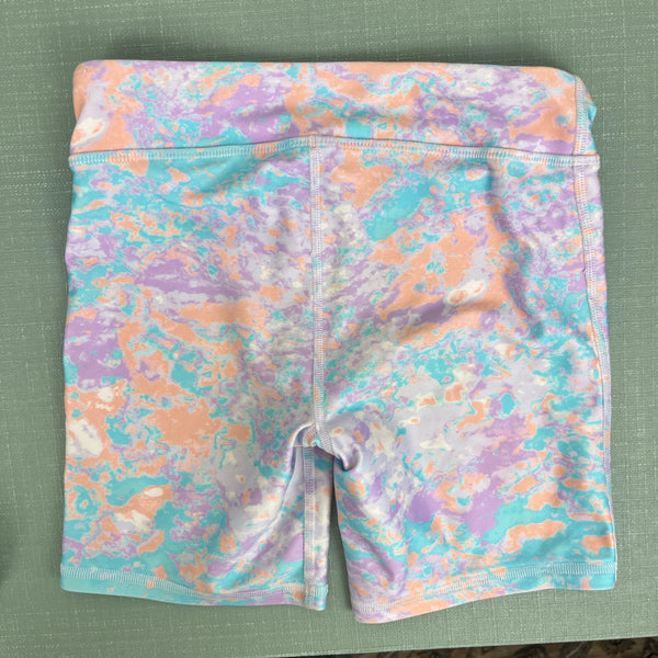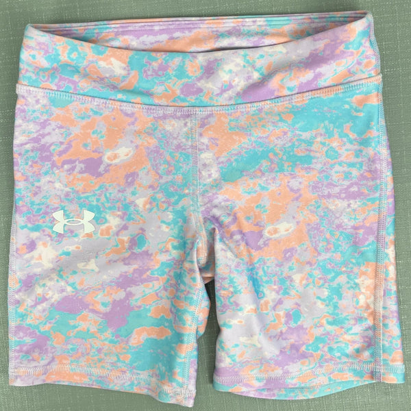 Under Armour Girls Heat Gear Printed Bike Shorts. I can't find the size anywhere, but based on how these fit my daughter, I'd guess these are an 8. Fun green, orange, and purple marbled print. Designed to keep you cool when it's hot. Perfect for spring and summer sports! Light wear to the fabric.