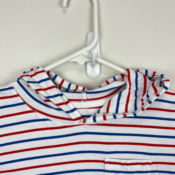 Vineyard Vines Girls Long-Sleeve Whale Hoodie Tee Dress. Girls size large (14 years). Long sleeve t-shirt dress in red, white, and blue stripes. Fixed hood. Signature, preppy whale logo on the pocket and in the back. Faint mark on hood (see last photo; untreated), but otherwise great condition. Great for casual summer wear or throwing over a bathing suit!