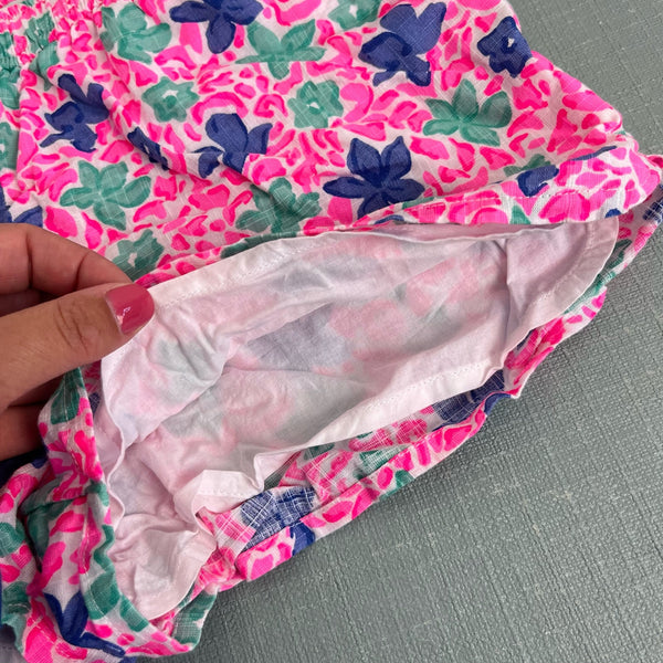 Vineyard Vines Pull On Plumeria Floral Short Malibu Pink. Girls size small (7-8 years). Preppy pull on shorts in pink, green, and blue flower print. Has elasticized waist and pockets. Lined.