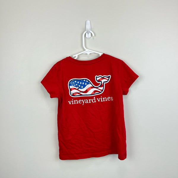 Vineyard Vines Short Sleeve Whale T-Shirt. Girls size small (7-8 years). Casual short sleeve crimson red top with preppy American flag whale on the front pocket and in the back. Perfect for 4th of July and all summer long!