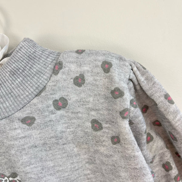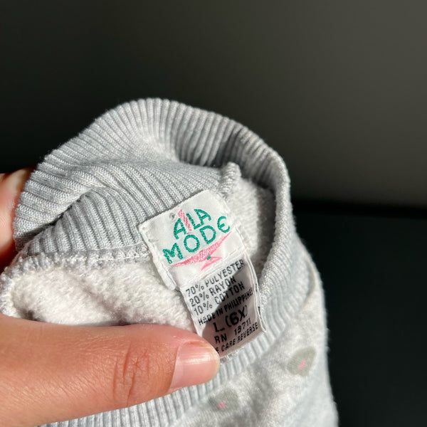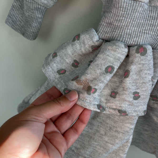 Vintage Ala Mode Drop Waist Cheetah Sweatshirt Dress. Little girl size 6. Casual long sleeve gray dress with layered ruffle skirt and fun cheetah (leopard?) design. Small mark (see last photo; untreated) and typical wear.