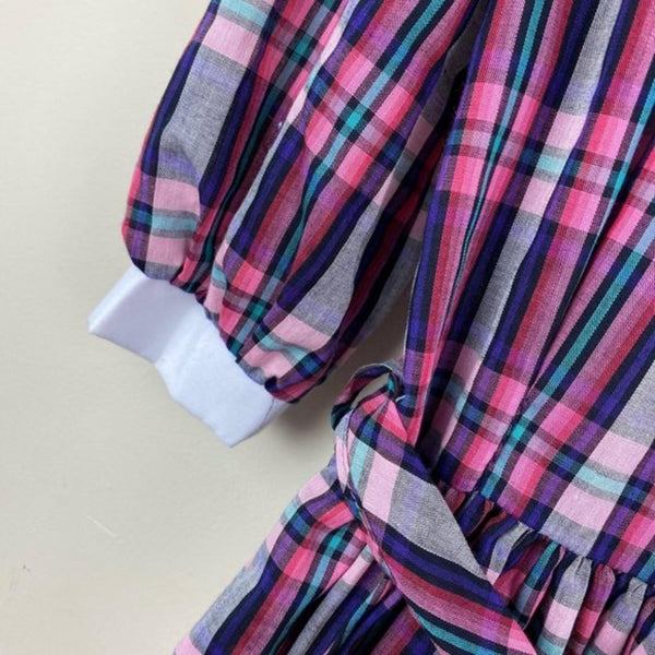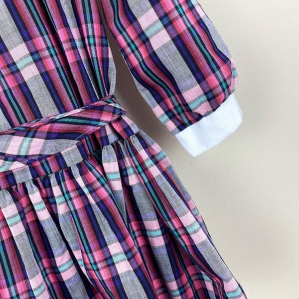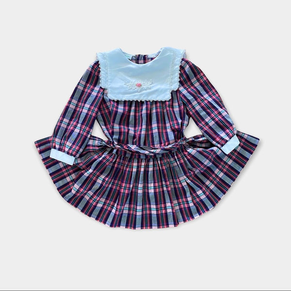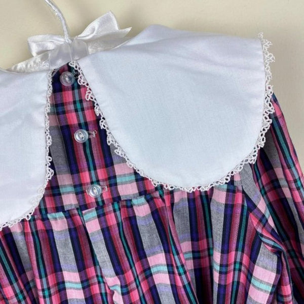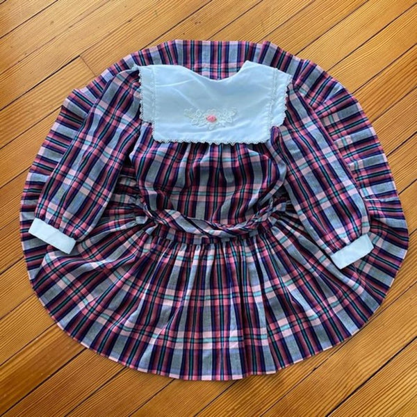 Vintage Girls Rare Editions Full Circle Plaid Dress. Size tag cut out, so please go by STH (fits like a size 6). Click through for the close ups to see the colors better – so pretty! Long-sleeves and oversized white bib collar. Perfect for a party!