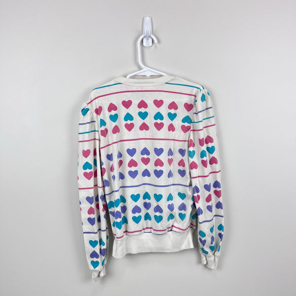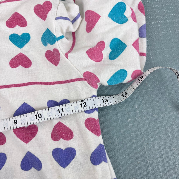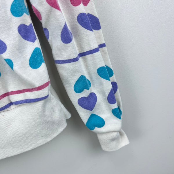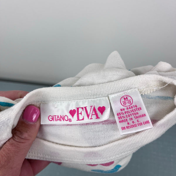 Vintage 80s 90s Gitano Eva Hearts & Striped Pullover Top. Girls size medium (10-12 years), but definitely fits smaller. (More like a 7/8, but please check measurements to ensure fit.) Long sleeve light-weight sweatshirt. Creamy white with colorful stripes and hearts. Snaps at the shoulder for easy on/off. Light wear; no stains, tears, etc. The cutest!