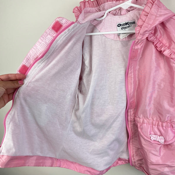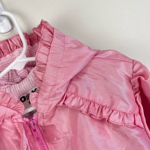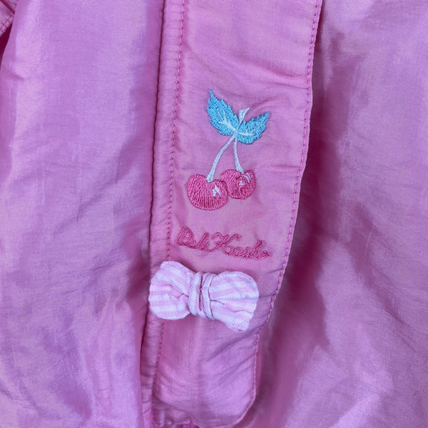 Vintage OshKosh B'gosh Pink Ruffle Bow Windbreaker Jacket. Girls size large (6 years). Lightweight coat with full zip, fixed hood, and elasticized cuffs and waist. So cute with ruffles, seersucker striped bows, and embroidered cherries. Fully lined. Perfect for spring!