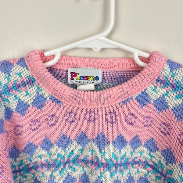 Vintage Picame Pink Fair Isle Argyle Sweater. Girls size 10-12 years. USA made. Cozy knit pullover sweater. Pink with pastel blue purple snowflake pattern. So cute worn oversized paired with leggings!