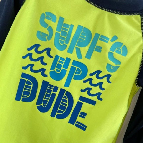 OshKosh B'Gosh Boys Neon Rash Guard. Baby toddler boy size 18 months. Long sleeve swim shirt for extra protection from the sun. Navy blue with neon yellow green. Surf's up dude. Light marks on bottom of shirt; no other flaws to note.