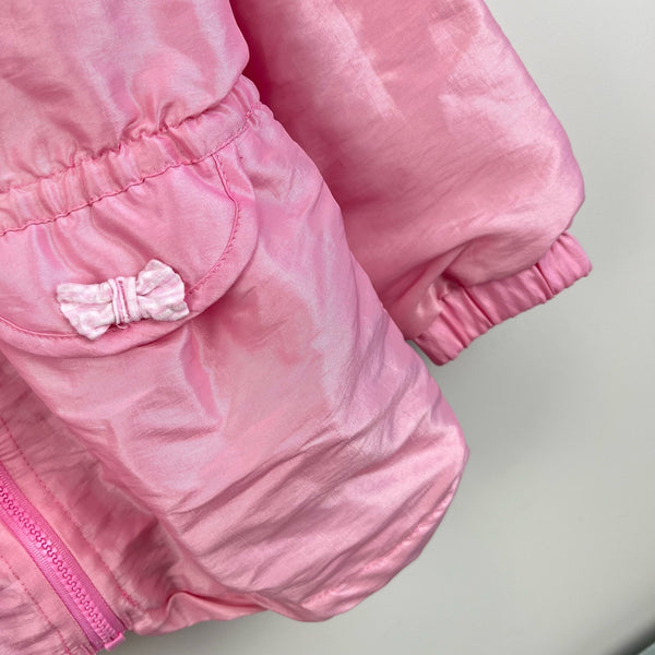 Vintage OshKosh B'gosh Pink Ruffle Bow Windbreaker Jacket. Girls size large (6 years). Lightweight coat with full zip, fixed hood, and elasticized cuffs and waist. So cute with ruffles, seersucker striped bows, and embroidered cherries. Fully lined. Perfect for spring!