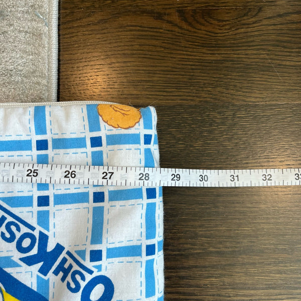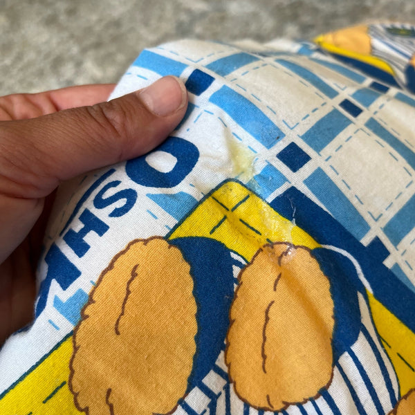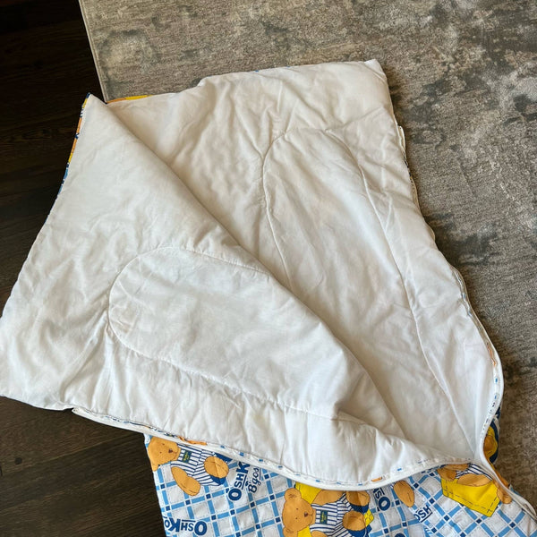 Vintage OshKosh B'gosh Teddy Bear Sleeping Bag. Made in Canada. Standard child size (see photos for measurements). White and blue plaid with OshKosh logo and teddy bears wearing overalls! Typical wear to fabric due to age and has something on it in one spot (see last photo; has not been washed and may come right out). So cute for your kiddo's first sleepover!
