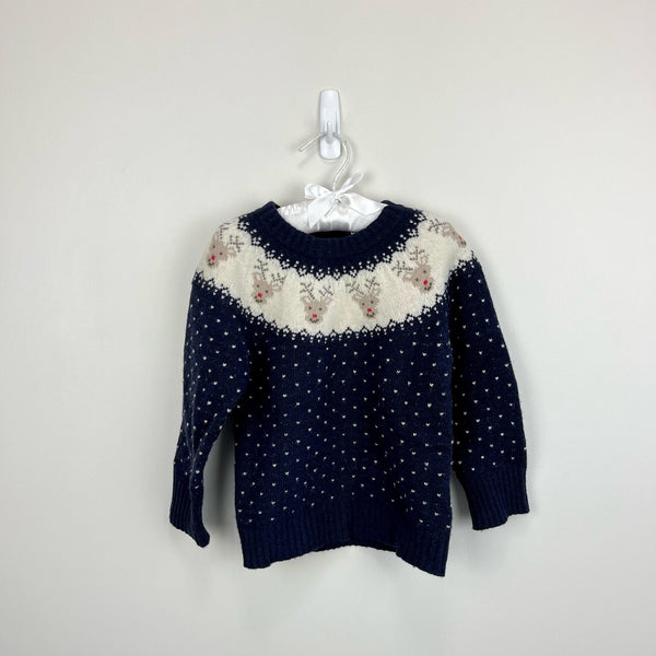 JoJo Maman Bebe Navy Fair Isle Reindeer Sweater. Toddler boy or girl size 2-3 years. Cozy lambswool blend crewneck sweater in navy blue with white dots and adorable red nose Rudolf reindeer faces around the neck. Buttons in the back for easy on/off. Perfect for Christmas!