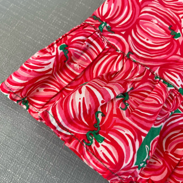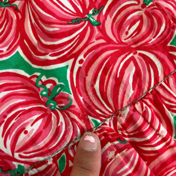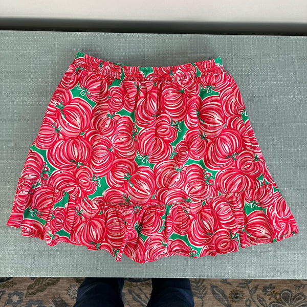 Lilly Pulitzer Punkin Chunkin Bella Skirt. Girls size M (6-7 years). Hard to find print is perfect for fall! Pull on style with elastic waist and ruffle hem. Fun orange and jade green pumpkin patch print with little mice. Just noticed a tiny flaw (see photo; untreated) but overall great condition!
