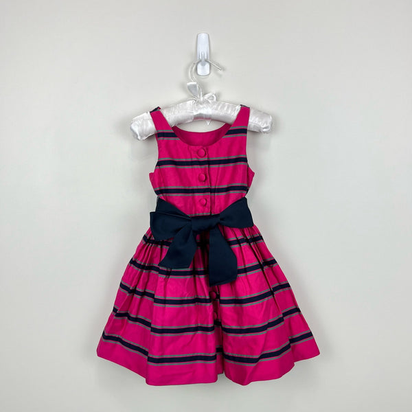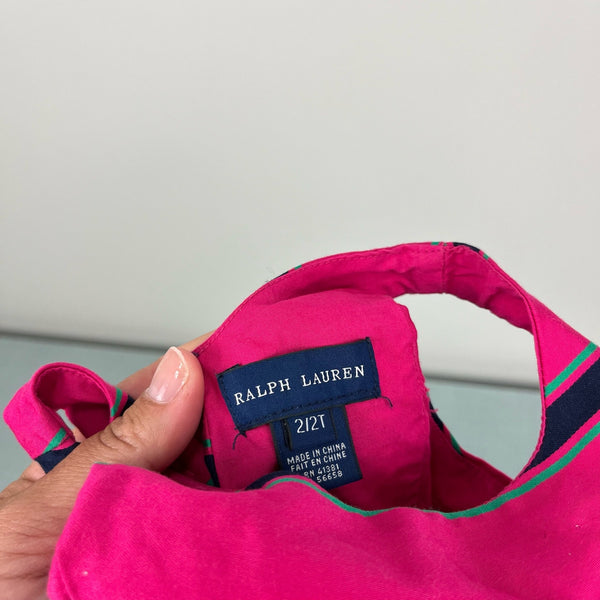 Ralph Lauren Striped Cotton Poplin Dress. Toddler girl size 2T. Sleeveless bright pink fit and flare dress with preppy navy blue and green stripes. Rounded neckline and buttoned placket with hook-and-eye closure in the back. Princess seams at the front and the back waist. Fully lined. Comes with a removable grosgrain sash. (Stitching from tag on ribbon is visible, but I assume non-issue if you remove the tag; see last photo.)