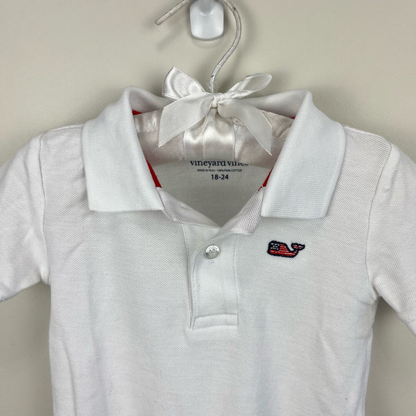 Vineyard Vines Flag Whale Polo Onesie. Baby toddler boy size 18-24 months. Short sleeve, preppy white polo shirt in the convenience of a bodysuit. Signature embroidered whale logo on the chest. Button placket and snaps at the bottom. Cozy pima cotton. Excellent condition!