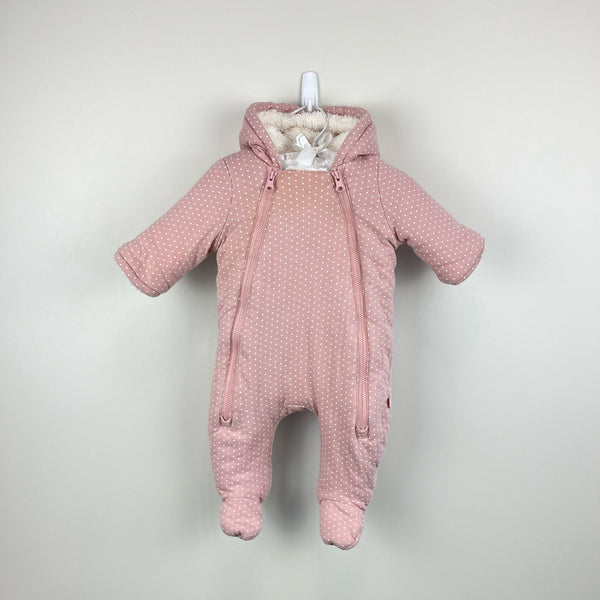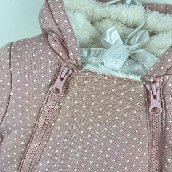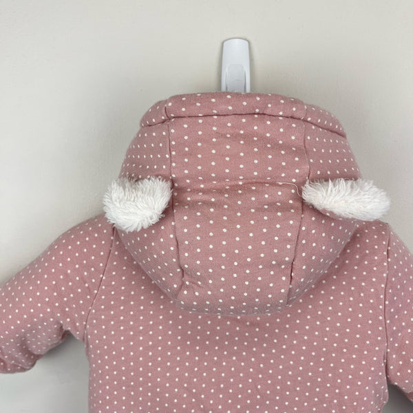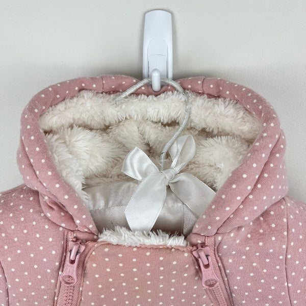 Baby Gap ColdControl Coziest Bundler Snowsuit Pink. Baby girl size 0-3 months. Pink and white polka dot print. Soft jersey knit outer shell with super soft, plush fleece lining. Double zip front for easy on/off. Attached feet and the cutest teddy bear ears on the fixed hood. Faint discoloration at the neck (see photos; untreated), but otherwise perfect!