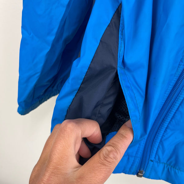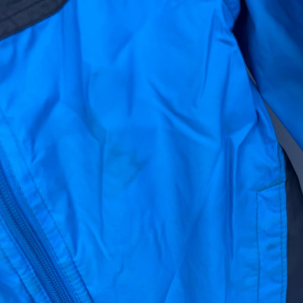 Columbia Boys Blue Windbreaker Jacket. Toddler boy size 3T. Mixed navy and bright blue. Light weight coat features fixed hood, full length zipper, interior ID label, and pockets. Has some light marks (see last two photos; untreated), but otherwise great condition!
