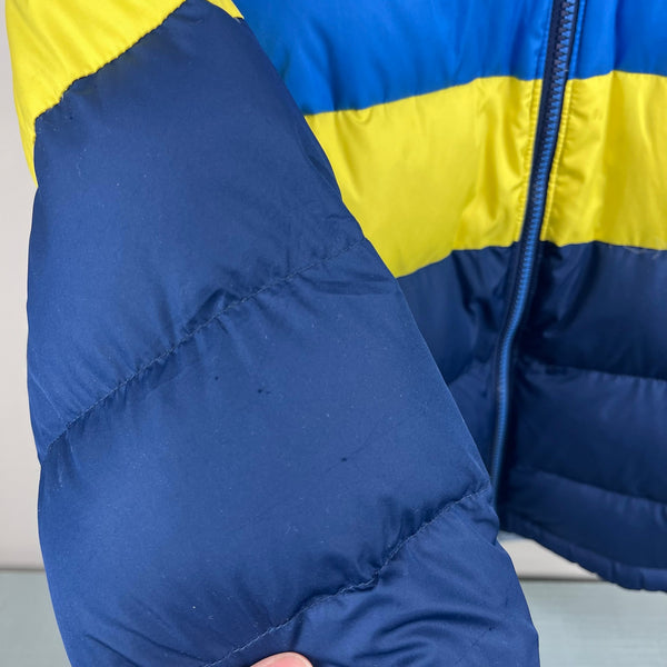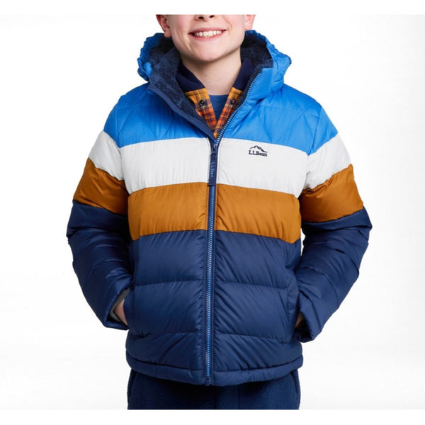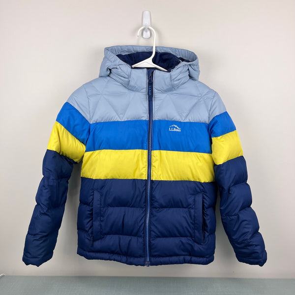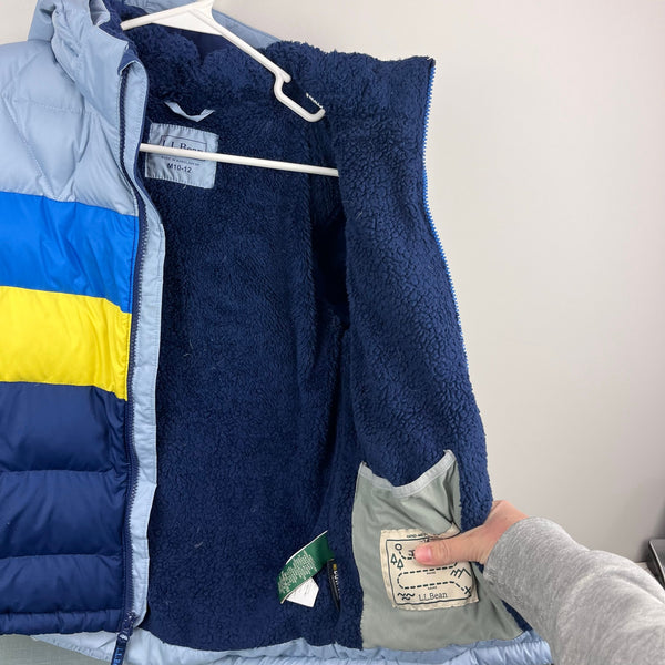 L.L. Bean Kids Down Jacket Colorblock Blue Yellow Citron. Boys size medium (10-12 years). Warm and cozy down filled winter coat. Navy with blue, yellow, and gray. Soft fleece lining. Removable hood. Great condition with tiny scratches on the sleeve (see close up photo). See photo from the website for more details (from this year's version; may have slight differences). Retail $120.