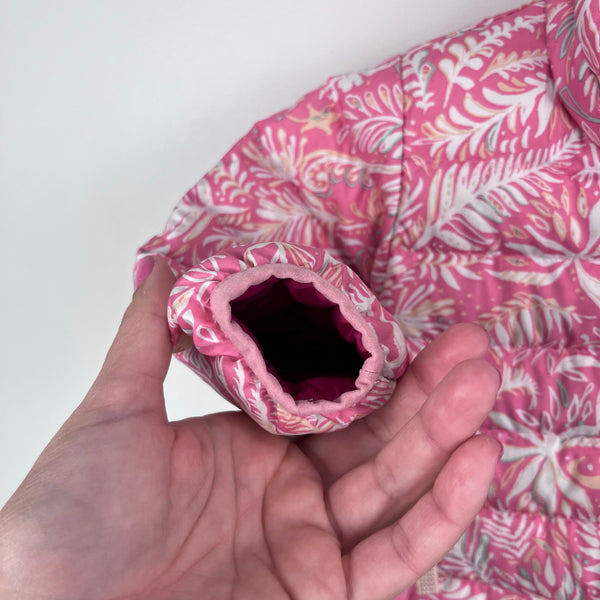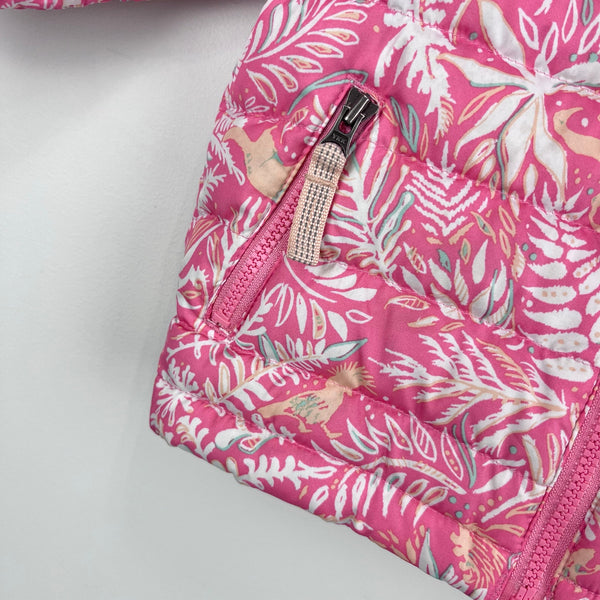 Patagonia Baby Printed Down Sweater Coat. Baby girl size 3-6 months. Lightweight, but warm down insulated jacket with a water repellent finish. Light pink with fun jungle themed print - leaves, birds, and other critters. Has zipper pockets and interior ID label. Excellent condition with no flaws noted. See photos from the website for more details (from this year's version; may be slight differences).