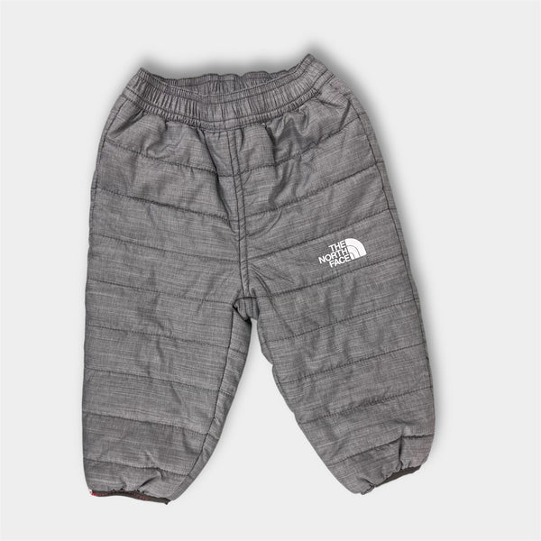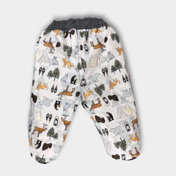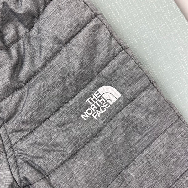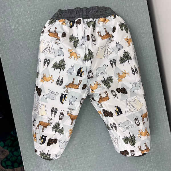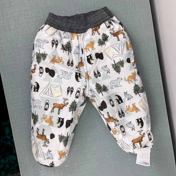 The North Face Infant Reversible Perrito Snow Pants Gray Woodland Animals. Baby boy or girl size 3-6 months. Fully reversible from quilted solid gray on one side to adorable print featuring tents, trees, moose, bears, and more! Perfect condition.