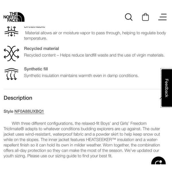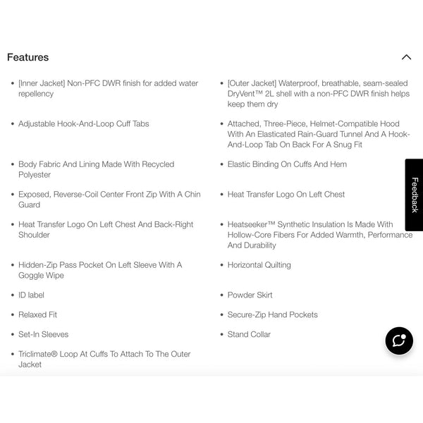 Features: Non-PFC DWR finish for added water repellency [Inner Jacket] Waterproof, breathable, seam-sealed DryVent™ 2L shell with a non-PFC DWR finish helps keep them dry [Outer Jacket] Adjustable Hook-And-Loop Cuff Tabs Attached, Three-Piece, Helmet-Compatible Hood With An Elasticated Rain-Guard Tunnel And A Hook-And-Loop Tab On Back For A Snug Fit Body Fabric And Lining Made With Recycled Polyester Elastic Binding On Cuffs And Hem Exposed, Reverse-Coil Center Front Zip With A Chin Guard Heat Transfer Logo On Left Chest Heat Transfer Logo On Left Chest And Back-Right Shoulder Heatseeker™ Synthetic Insulation Is Made With Hollow-Core Fibers For Added Warmth, Performance And Durability Hidden-Zip Pass Pocket On Left Sleeve With A Goggle Wipe Horizontal Quilting ID label Powder Skirt Relaxed Fit Secure-Zip Hand Pockets Set-In Sleeves Stand Collar Triclimate® Loop At Cuffs To Attach To The Outer Jacket