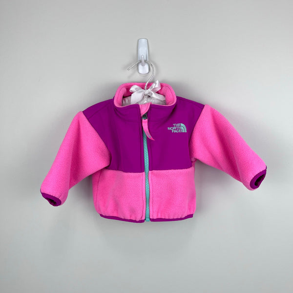 The North Face Pink Denali Fleece Jacket. Baby girl size 0-3 months. Classic full zip fleece coat in mixed pinks with aqua green zipper and logo . Great for fall and spring, or even layering on milder winter days.
