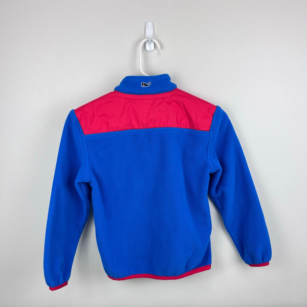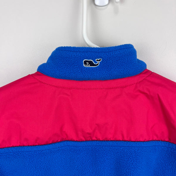 Vineyard Vines Blue Red Fleece Shep Shirt. Boys size small (8-10 years). Bright blue quarter zip pullover jacket with contrasting red binding and fabric across the shoulder. Soft and cozy fleece. Signature whale logo on back of neck. Great condition with no flaws noted.