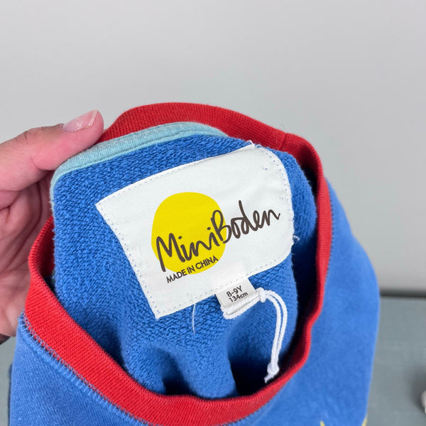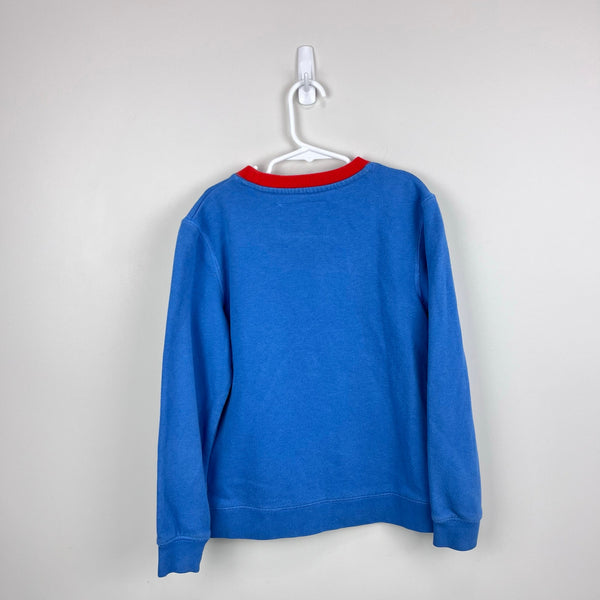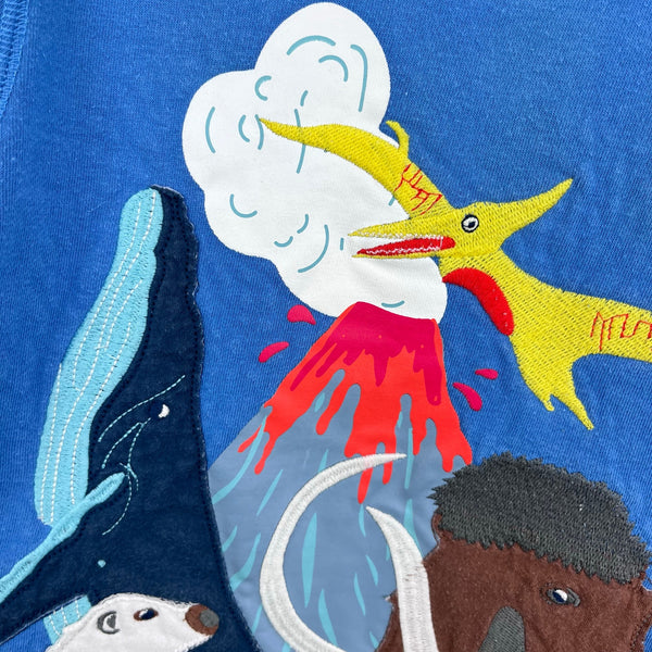 Mini Boden Graphic Crew Sweatshirt Elizabethan Prehistoric Blue Animals Applique. Boy or girl size 8-9. Cozy pullover sweatshirt. Blue with red trim and fun applique volcano, polar bear, turtle, whale, pterodactyl, and wooly mammoth on the front.