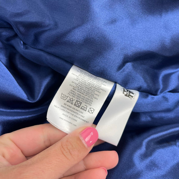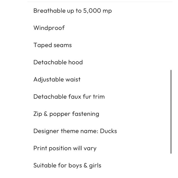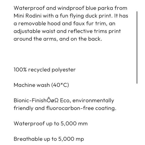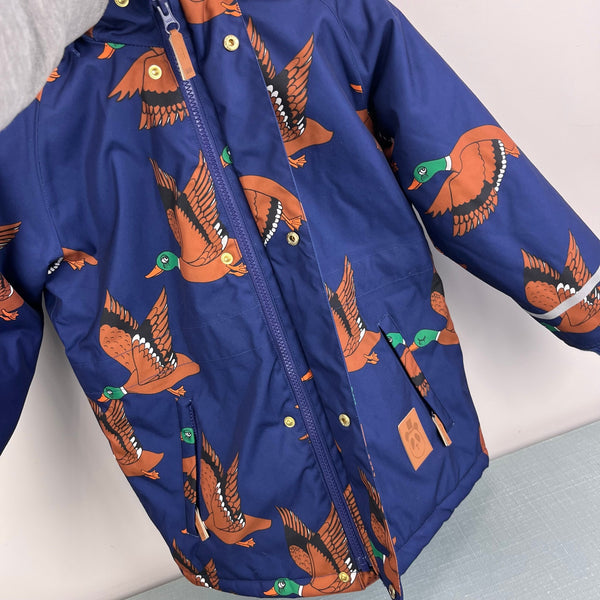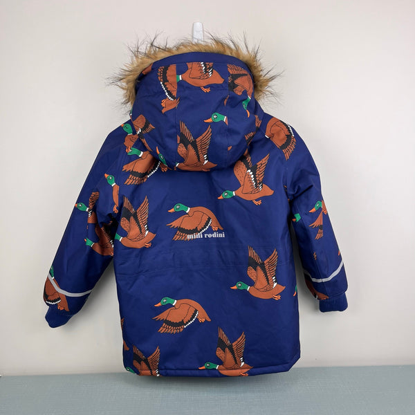 Mini Rodini K2 Wild Duck Padded Parka Winter Coat Navy. Boy or girl size 128-134 cm (US 7-9 years). Warm, heavy duty jacket in navy blue with fun mallard duck print. Features removable faux fur lining on the hood, soft ribbed lining at the neck, wind flap, zippered pockets, reflective detail, ID label, and more. Like new condition (probably new without tags).