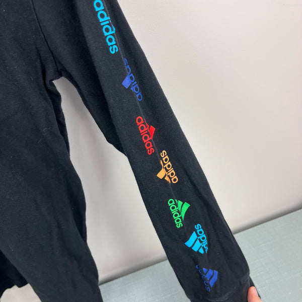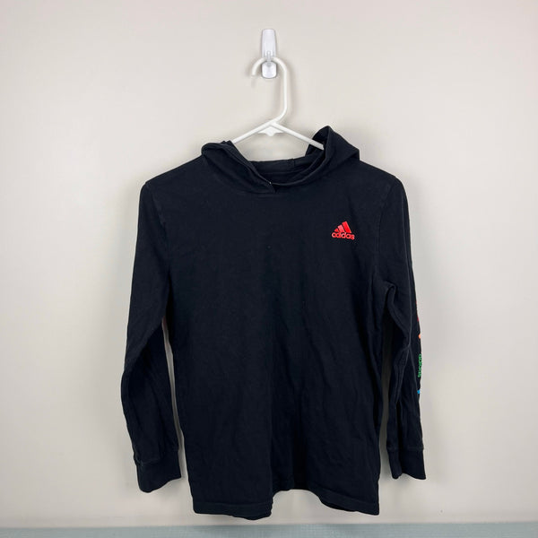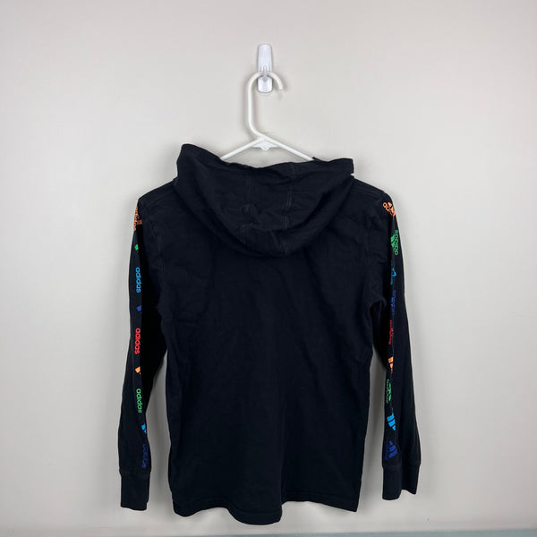 Adidas Long Sleeve Black Hoodie Logo T-Shirt. Boy (or girl) size medium (10-12). Casual long sleeve top with hood and colorful logos down both sleeves.