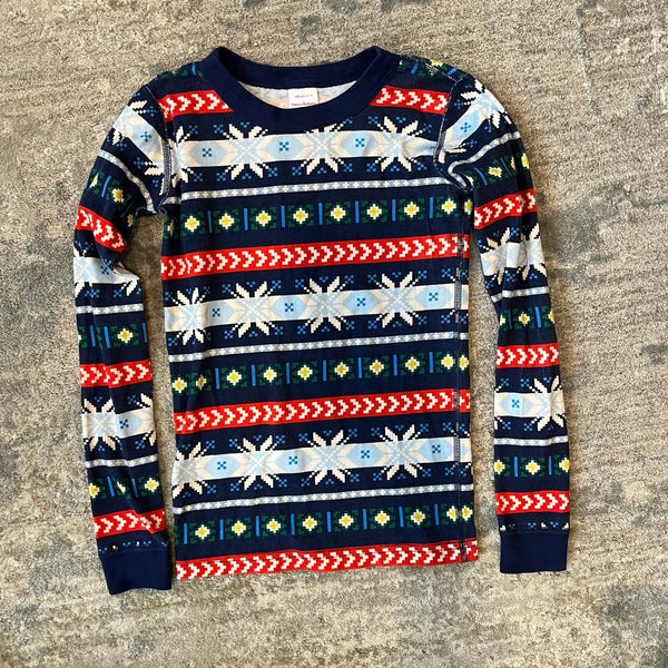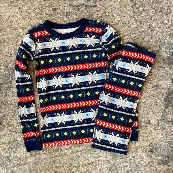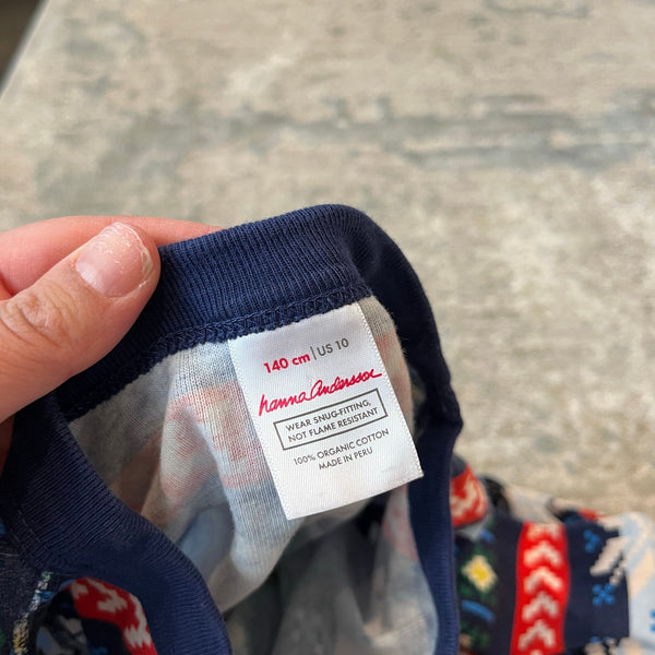 Hanna Andersson Scandi Snowflake Fair Isle PJs. Boy or girl size 140 cm (US 10 years). Fitted two piece long john pajama set. 100% organic cotton. Long-sleeves and pants. Festive print is perfect for Christmas and all winter long!